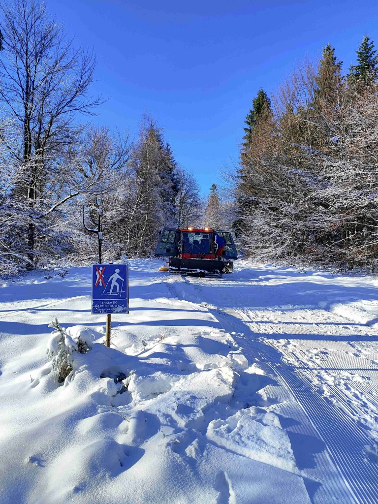 Dzisiaj na Magurce Wilkowickiej powiesiliśmy tabliczki z oznaczeniem trasy biegowej i udało się wyratrakować większość trasy. Po ubiciu śniegu ratrakiem pozostało ok 10cm i spokojnie można biegać. Nie wszędzie udało się założyć ślad, ale nie powinno to stanowić problemu dla biegaczy.